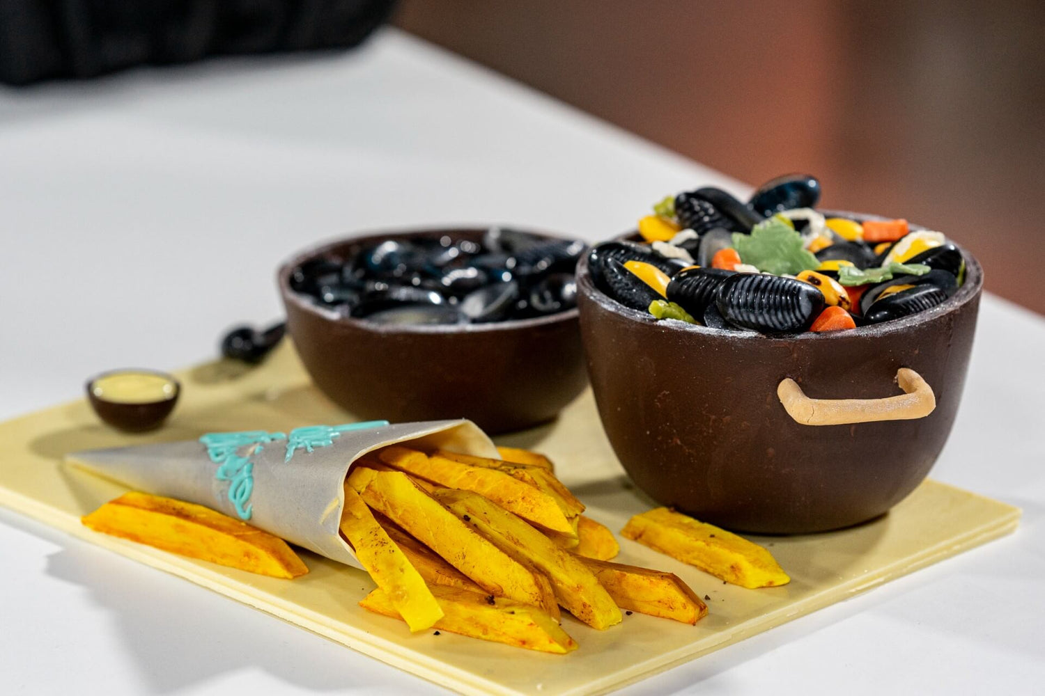 For their very first challenge, the contestants were thrown into the deep end with something both hilarious and technically demanding: creating a trompe-l’œil of a pot of moules-frites, Belgium’s ultimate comfort dish. Imagine it, mussels, fries, and even the steaming casserole, but made entirely out of chocolate! The judges wanted to see creativity, precision, and above all, the magic of illusion.