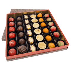 Ingredients: Suiker, cacaoboter, cacaomassa, melkpoeder, hazelnoot, amandel, room, granaatappelpuree, glucosestroop, sorbitol, boter, koffie, vruchtensap en -pulp (bosbessen, zwarte bessen, rode bessen), panela, pompoenkruiden (kaneel, nootmuskaat, kruidnagel, gember, chili, kardemom), mandarijn, zonnebloemlecithine, Bourbon vanille uit Madagaskar.