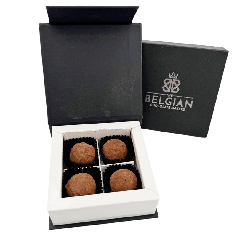 Geniet van onze doos met 4 Belgische chocoladetruffels met rijke cacaosmaak, handgemaakt in Brussel van ethische bonen. Een verfijnd geschenk of een gastronomische verwennerij.