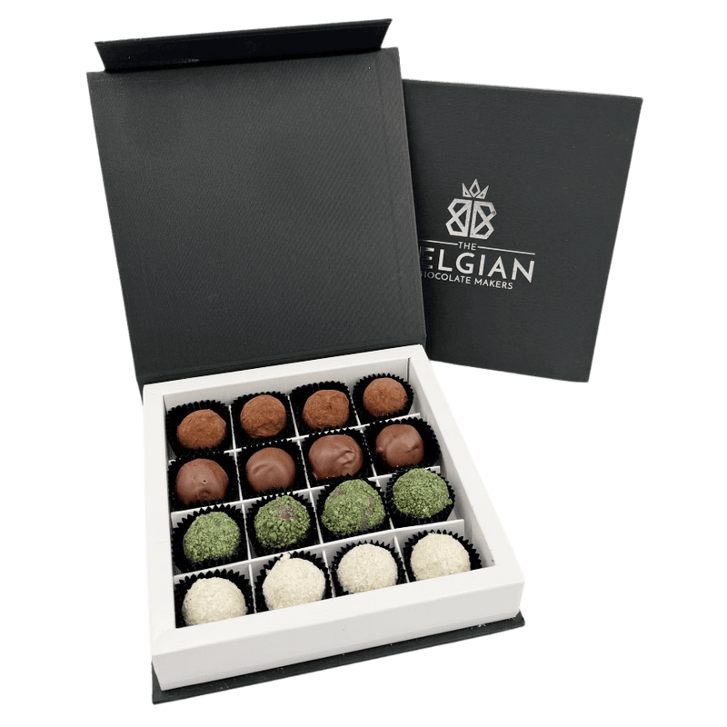 Verwen uzelf met onze doos van 16 Belgische chocoladetruffels in verschillende smaken, gemaakt in Brussel met ethische cacao. Een verfijnd geschenk of een gastronomisch genot om te delen.
