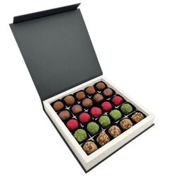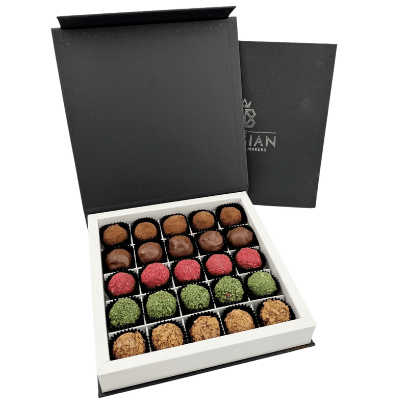 Verwen uzelf met onze doos van 25 Belgische chocoladetruffels in verschillende smaken, gemaakt in Brussel met ethische cacao. Een verfijnd geschenk of een gastronomisch genot om te delen.