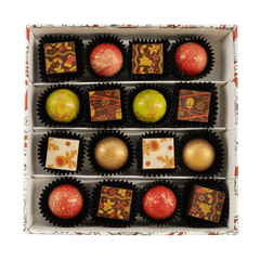 Vier de feestdagen met onze kerstdoos met 16 Belgische pralines, een elegant assortiment van handgemaakte bonbons gemaakt met eersteklas cacao, perfect om cadeau te geven of om zoete feestelijke momenten te delen met geliefden.