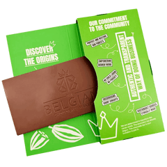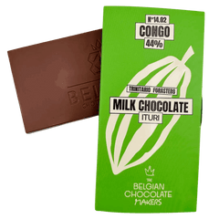 Congo Ituri 44% melkchocolade, met de hand gemaakt in Brussel van cacao van één enkele origine. Een zachte en romige reep met delicate noten en ethische herkomst.