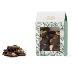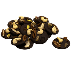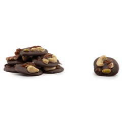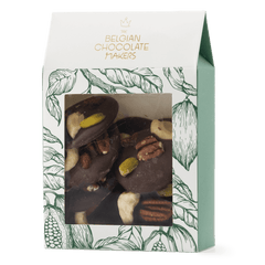 Heerlijke 150g pure chocolade mendiants met cashew, pistache, rozijnen en pecan stukjes, een perfecte mix van rijke cacao en knapperige goedheid.