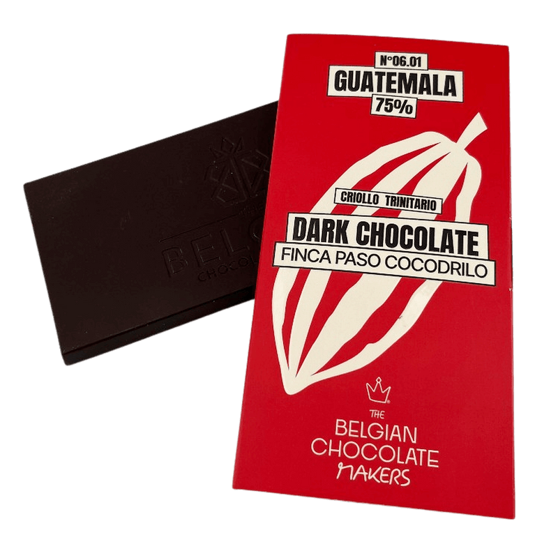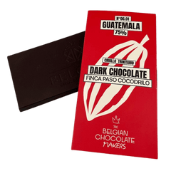 Guatemala Finca Paso Cocodrilo 75% pure chocolade, een exclusieve creatie van één enkele origine, met de hand gemaakt in Brussel. Een verfijnde reep met een elegante fruitige diepte en een uitzonderlijk terroir.