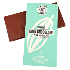 Handgemaakte melkchocoladereep Cap Haïtien 44%, gemaakt in Brussel van Haïtiaanse cacao van één enkele origine. Een reep van 100g met een zachte textuur en verfijnde smaaktoetsen.