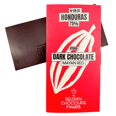 Honduras Mayan Red 75% pure chocolade, met de hand gemaakt in Brussel van cacao van één enkele origine. Een zeldzame reep met rijke toetsen van rood fruit en verfijnde complexiteit.