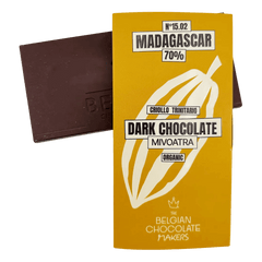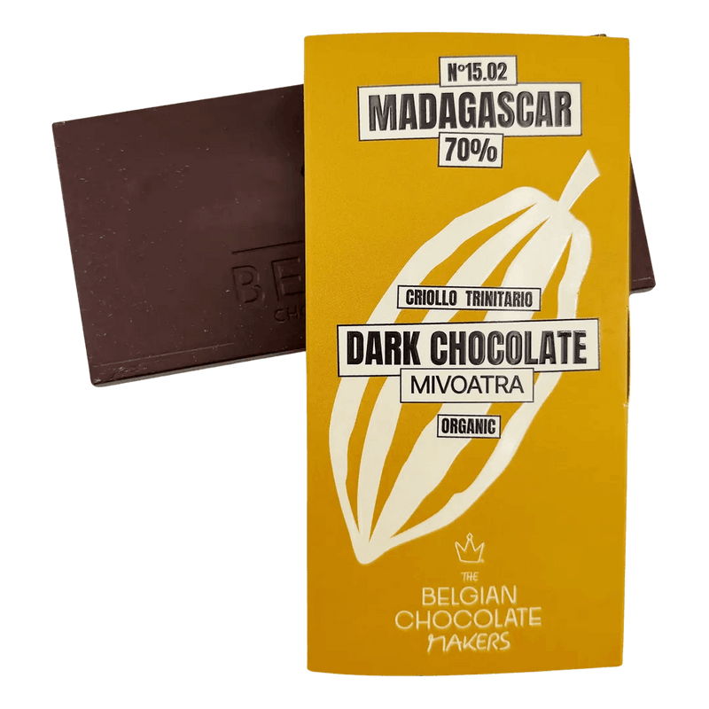 Ervaar de elegantie van Madagaskar Mivoatra 70% pure chocolade, een single-origin creatie met de hand gemaakt in Brussel van ethische cacao met verfijnde fruitige noten.