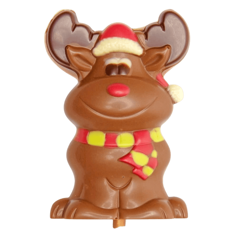 Schattige en heerlijke kerstlolly met rendier van melkchocolade, handgemaakt in Brussel met Belgische kwaliteitschocolade. Een feestelijke traktatie voor kinderen en chocoladeliefhebbers!