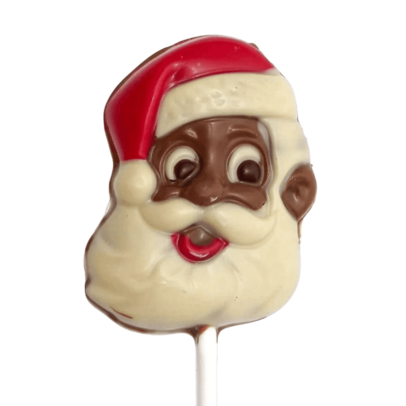 Feestelijke melkchocolade kerstman lolly, handgemaakt in Brussel met Belgische kwaliteitschocolade. Een vrolijke kersttraktatie voor kinderen en chocoladeliefhebbers.