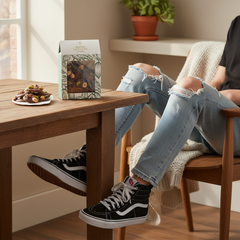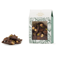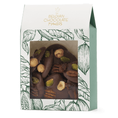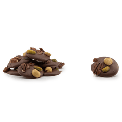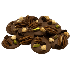 Heerlijke 150g melkchocolade mendiants met daarop stukjes pecannoot, pistache, rozijn en hazelnoot, een perfecte mix van rijke cacao en knapperig lekkers.