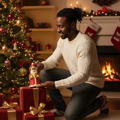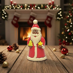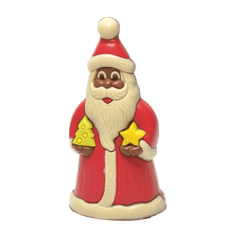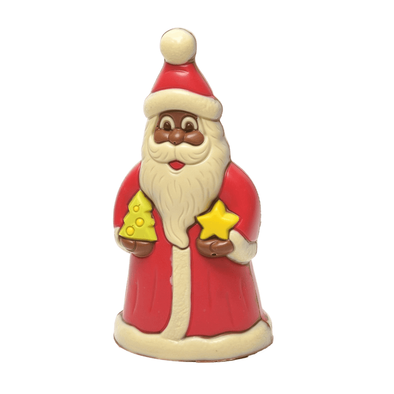 Handgemaakte 200g melkchocolade kerstman met cadeau, gemaakt met fijne cacao uit Haïti en zorgvuldig gemaakt in Brussel, een feestelijke traktatie vol vakantiemagie.