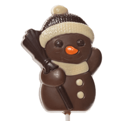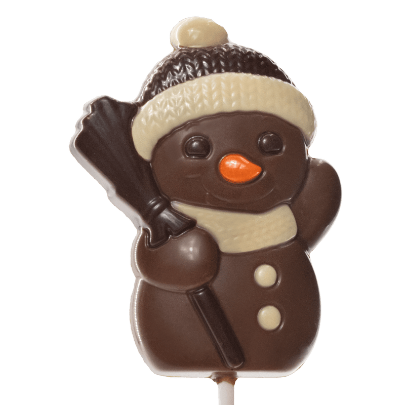 25g melkchocolade sneeuwpop lolly gemaakt in België met Haïtiaanse cacao, een feestelijke traktatie perfect voor vakantiegeschenken.