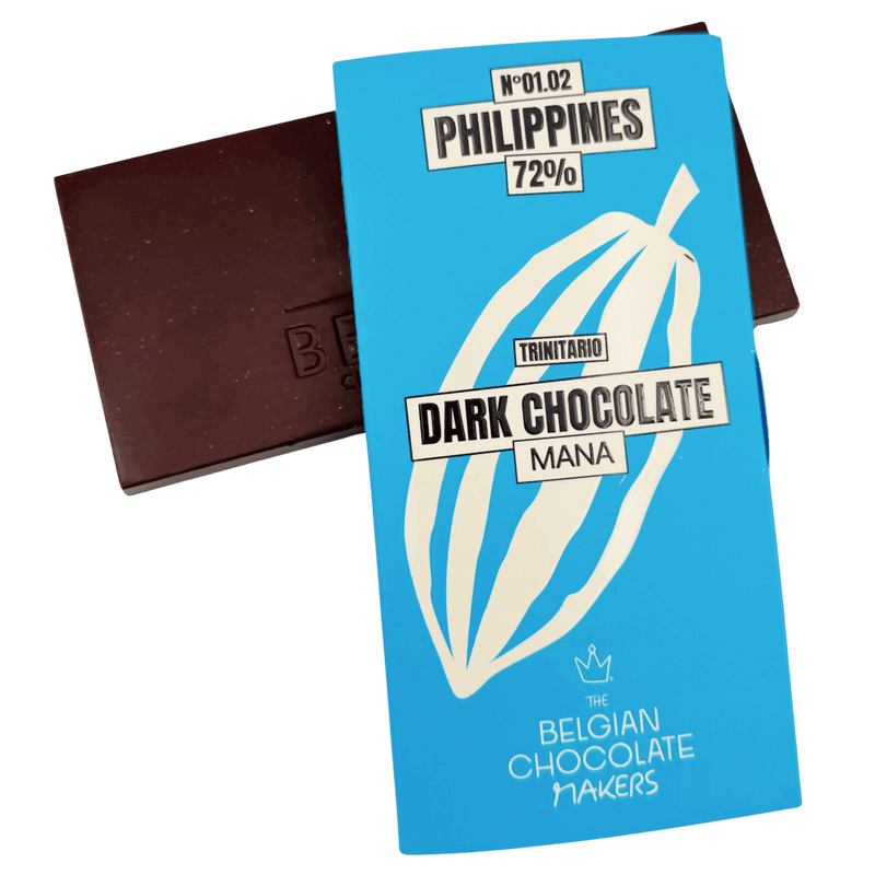 Philippines Mana 72% pure chocolade, een exclusieve reep van één enkele herkomst, met de hand gemaakt in Brussel. Zeldzame cacao met verfijnde tropische noten voor een echt elegante smaakervaring.