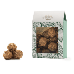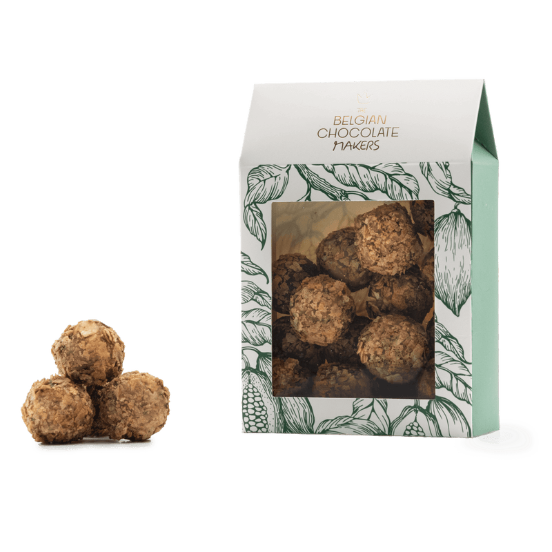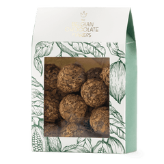 Geniet van onze 160g zak Belgische chocoladetruffels met feuilletine. Handgemaakt in Brussel, met een combinatie van zachte cacao en knapperige gekarameliseerde schilfers voor een echt verwennende crunch.