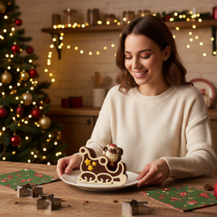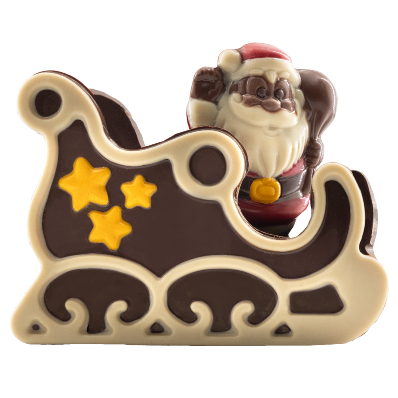 Vier Kerstmis met onze handgemaakte keramische chocolade kerstman in een slee (180g). Gemaakt in Brussel met duurzame en ethische chocolade en feestelijke details, een heerlijke Belgische traktatie voor de feestdagen.