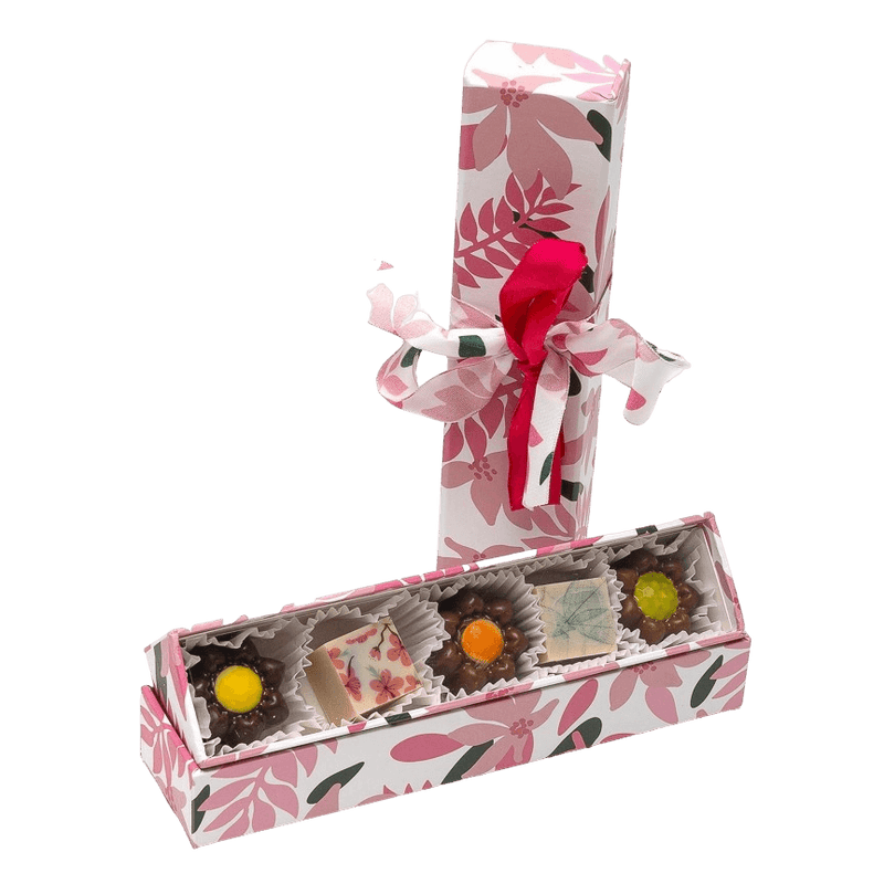 Geniet van onze lentedoos met 5 handgemaakte Belgische pralines (75g). Gemaakt in Brussel met eersteklas traceerbare cacao, is dit elegante mini-assortiment het perfecte seizoensgeschenk om de smaken en kleuren van de lente te vieren.