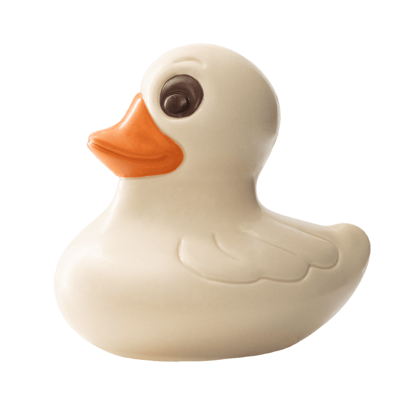 Charmante 150g handgemaakte witte chocolade eend, gemaakt met pure cacaoboter en zorgvuldig vervaardigd in Brussel, een zacht en romig genot.