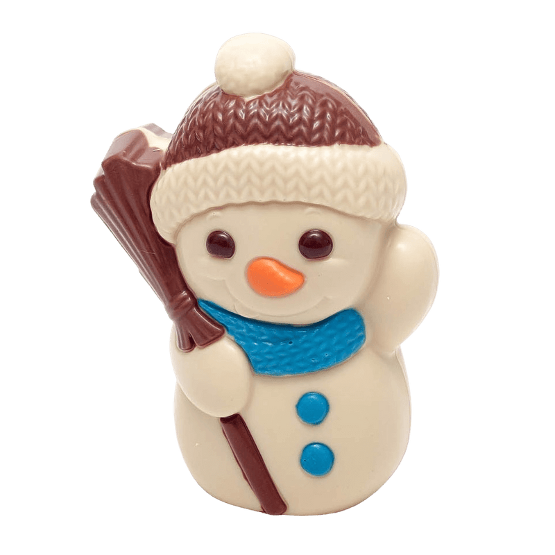 Geniet van onze handgemaakte sneeuwpop in romige witte chocolade, gemaakt in Brussel met pure cacaoboter. Een feestelijke traktatie van 150 g, perfect om cadeau te geven of om van te genieten.