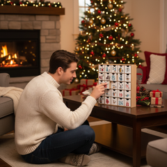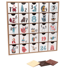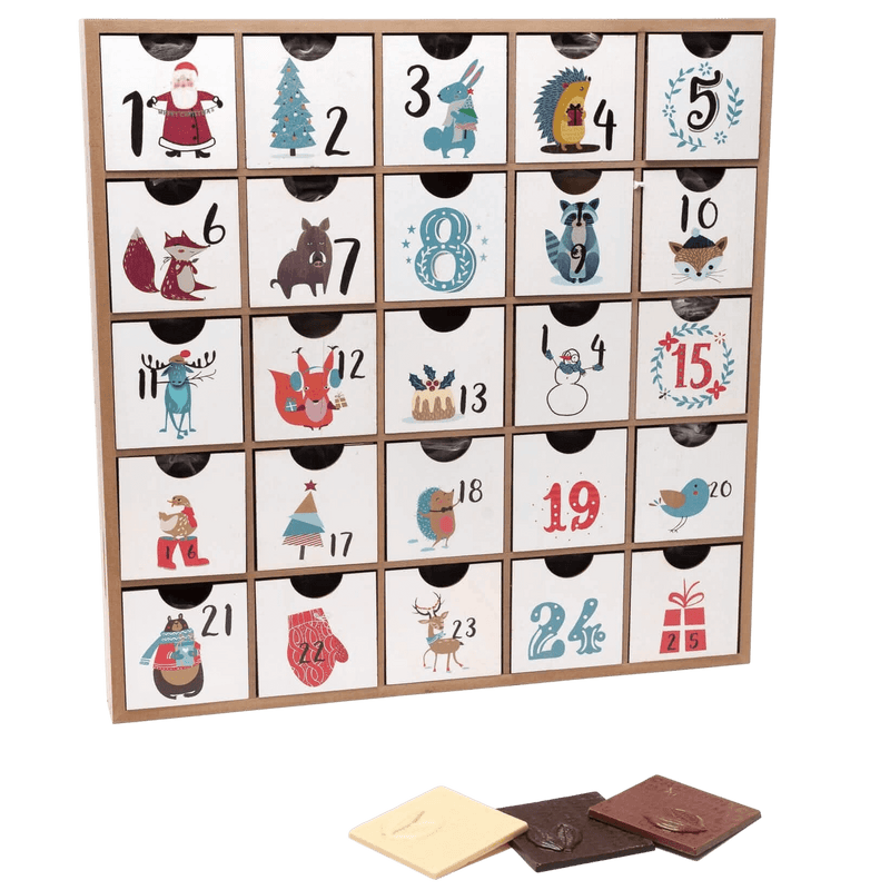 Ontdek onze houten adventskalender Origineel 1 kg, gevuld met handgemaakte Belgische chocolaatjes gemaakt van eersteklas single-origin cacao, een duurzame en elegante manier om af te tellen tot Kerstmis.