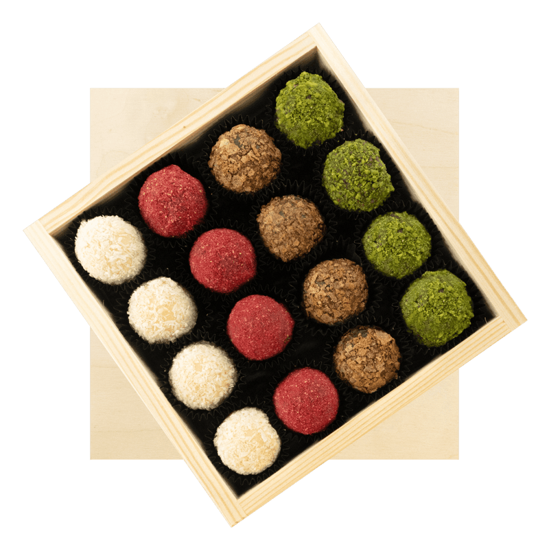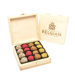 Koop onze houten geschenkdoos met 16 Belgische chocoladetruffels. Handgemaakt in Brussel, deze geschenkdoos van 240g is perfect voor chocoladeliefhebbers.